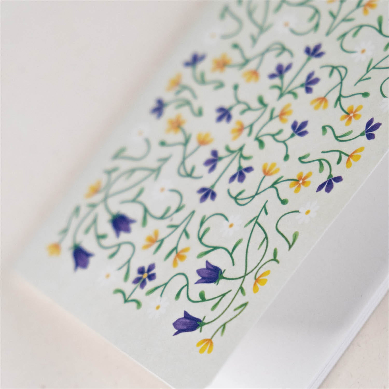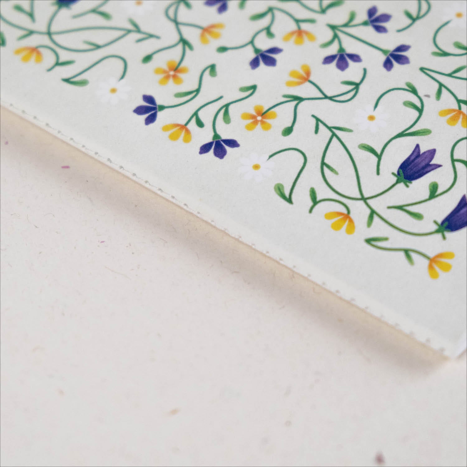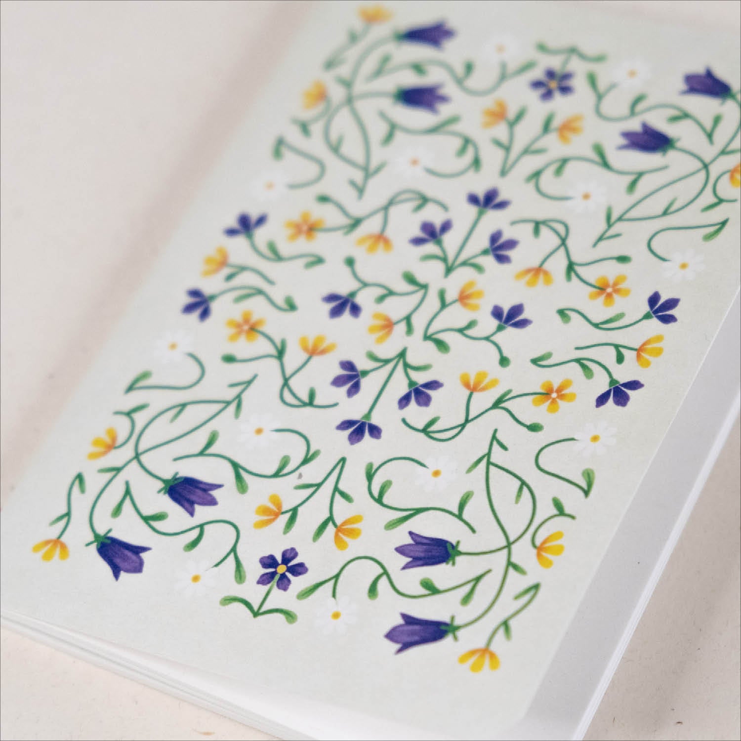 Beležka s cvetličnim motivom in brezčrtnimi listi. Priročne velikosti, da jo lahko vzamemo s seboj v naravo ter vanjo zapišemo opažanja o najdenih rastlinah ali jih narišemo. Izdelana je iz recikliranega papirja v domačem ateljeju.