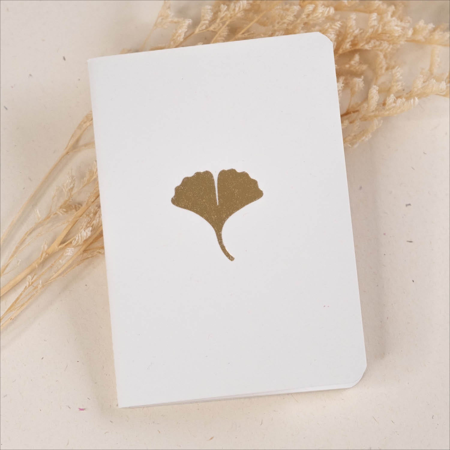 Beležka z zlatim odtisom lista drevesa ginko. Izdelana iz recikliranega papirja v domačem ateljeju.