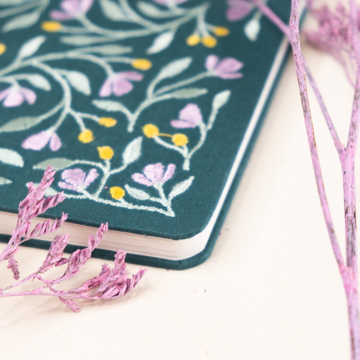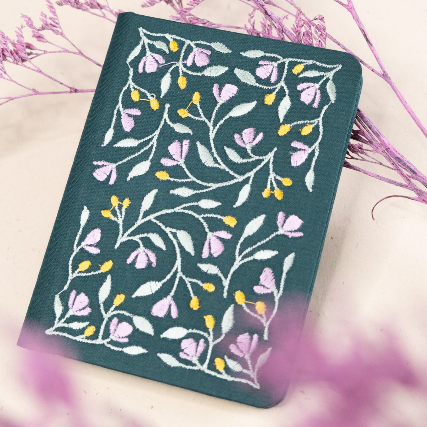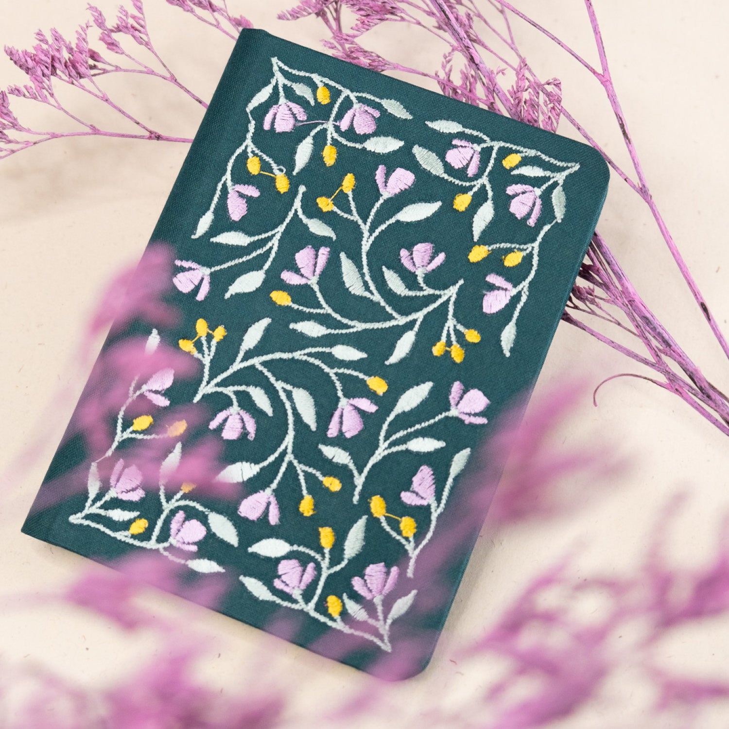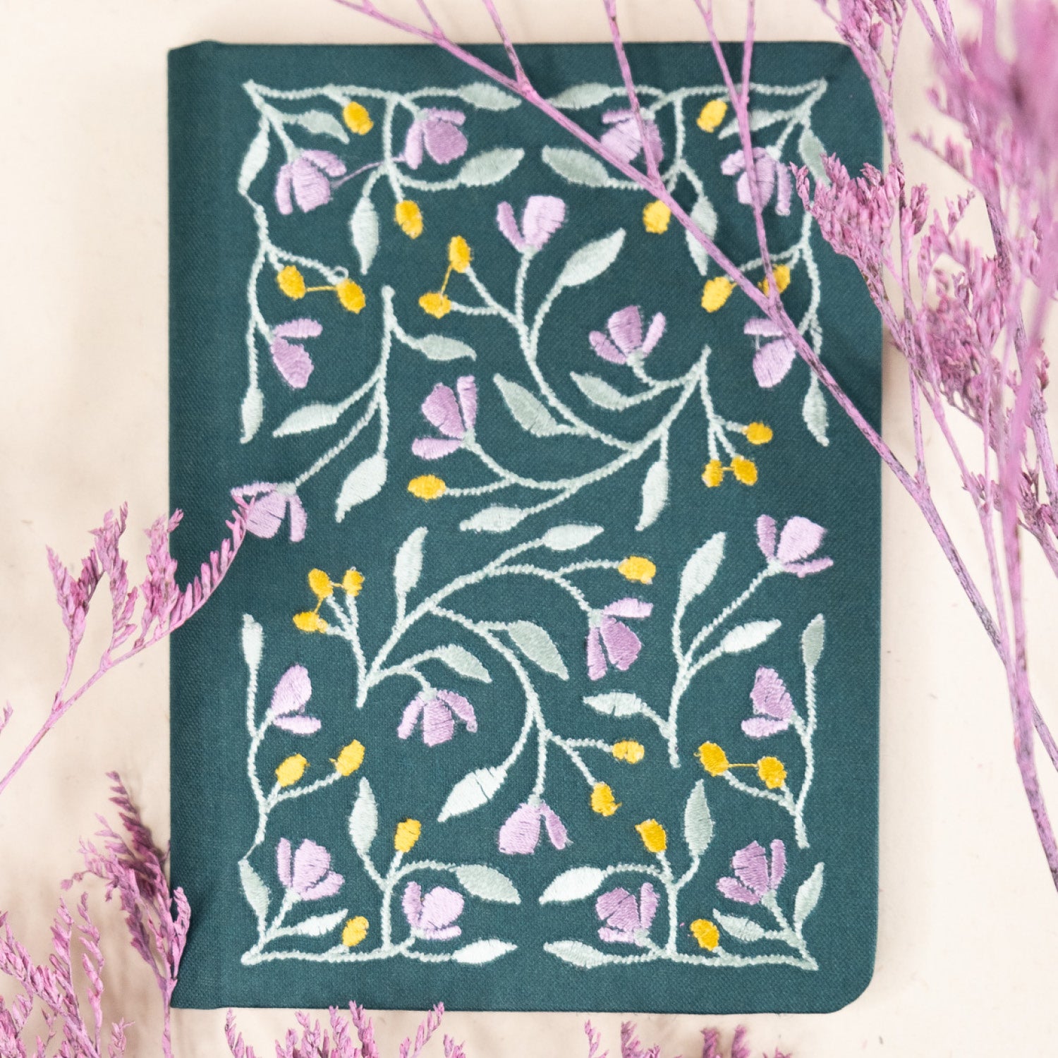 Beležnica s trdimi platnicami, oblečenimi v platno na katerega je izvezen cvetlični motiv. V notranjosti so brezčrtni listi.