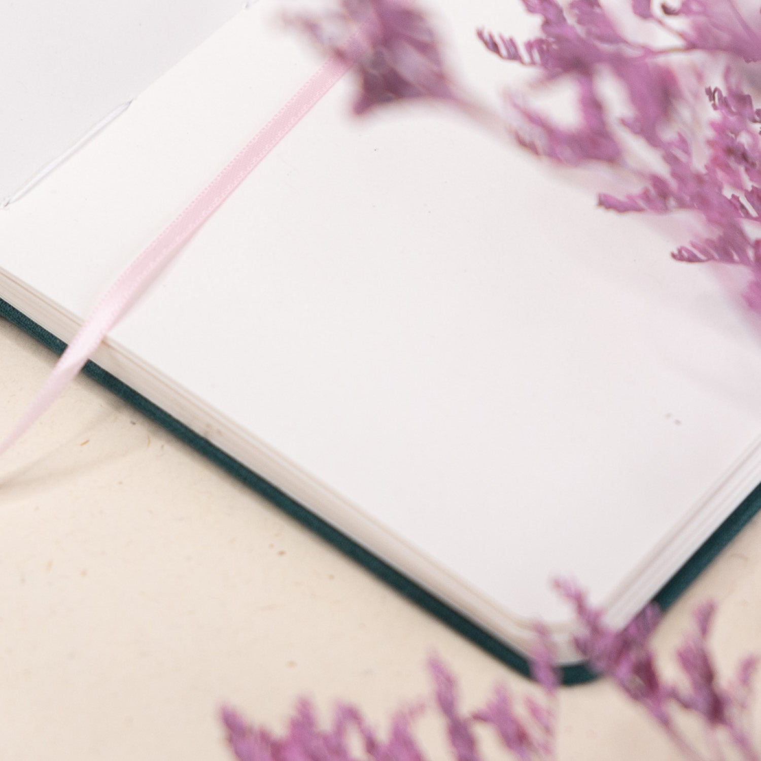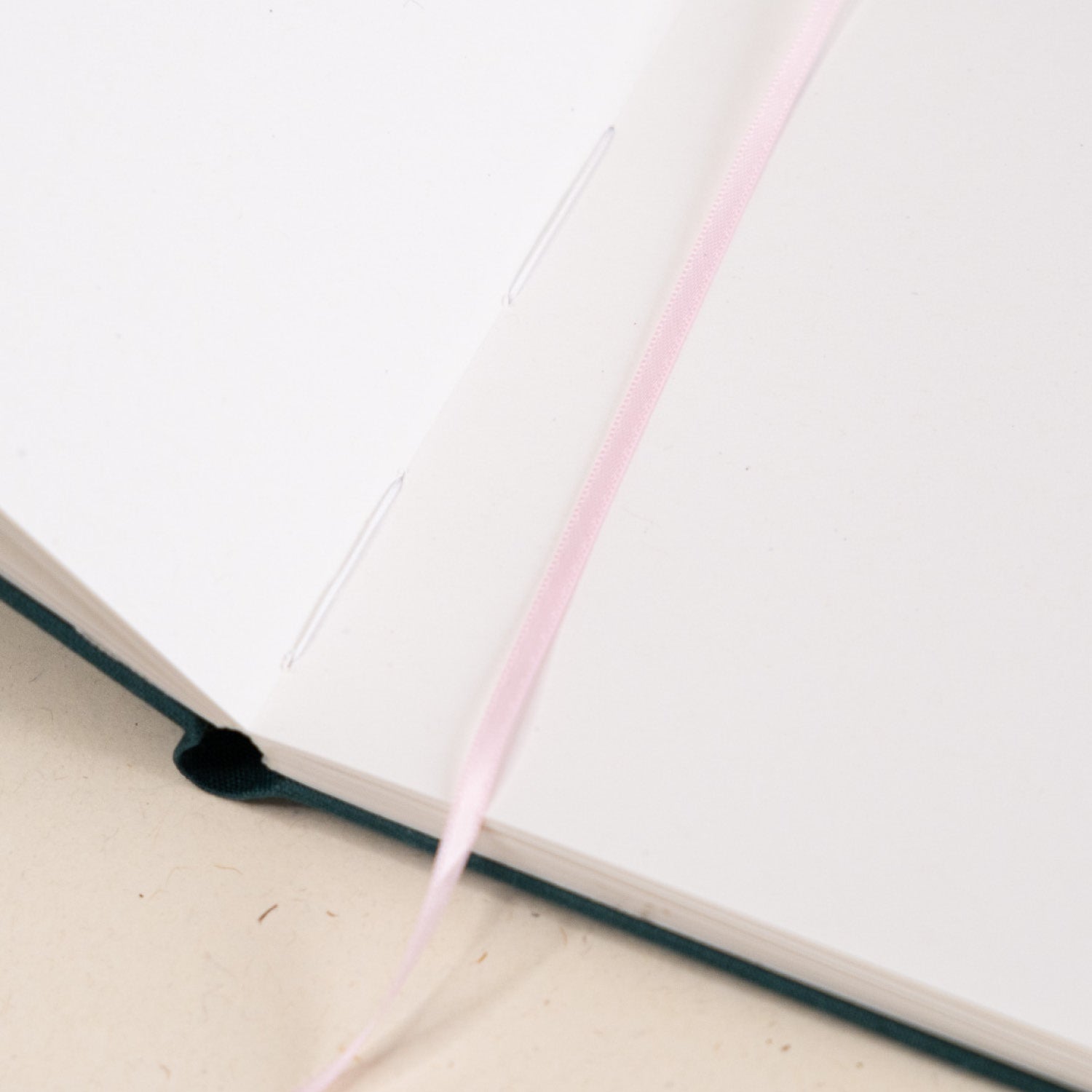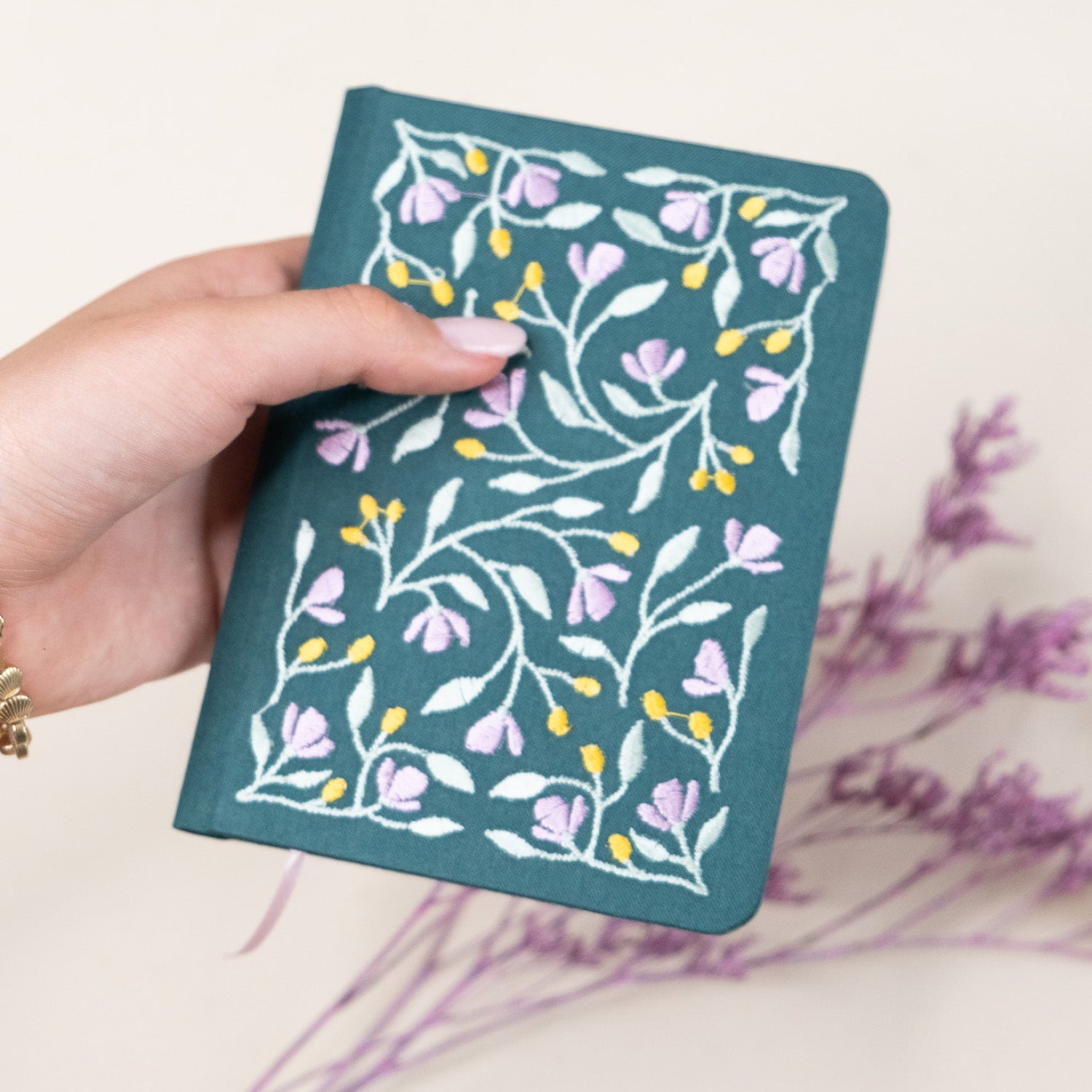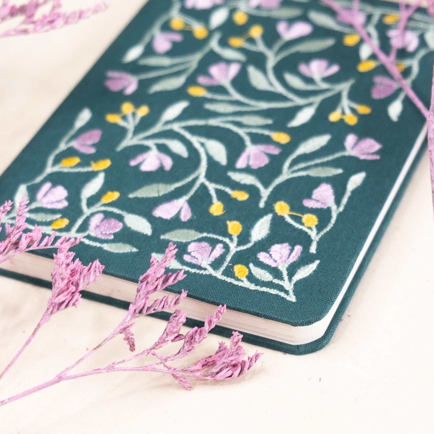 Beležnica s trdimi platnicami, oblečenimi v platno na katerega je izvezen cvetlični motiv. V notranjosti so brezčrtni listi.
