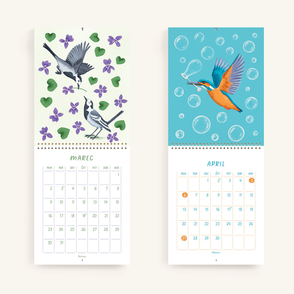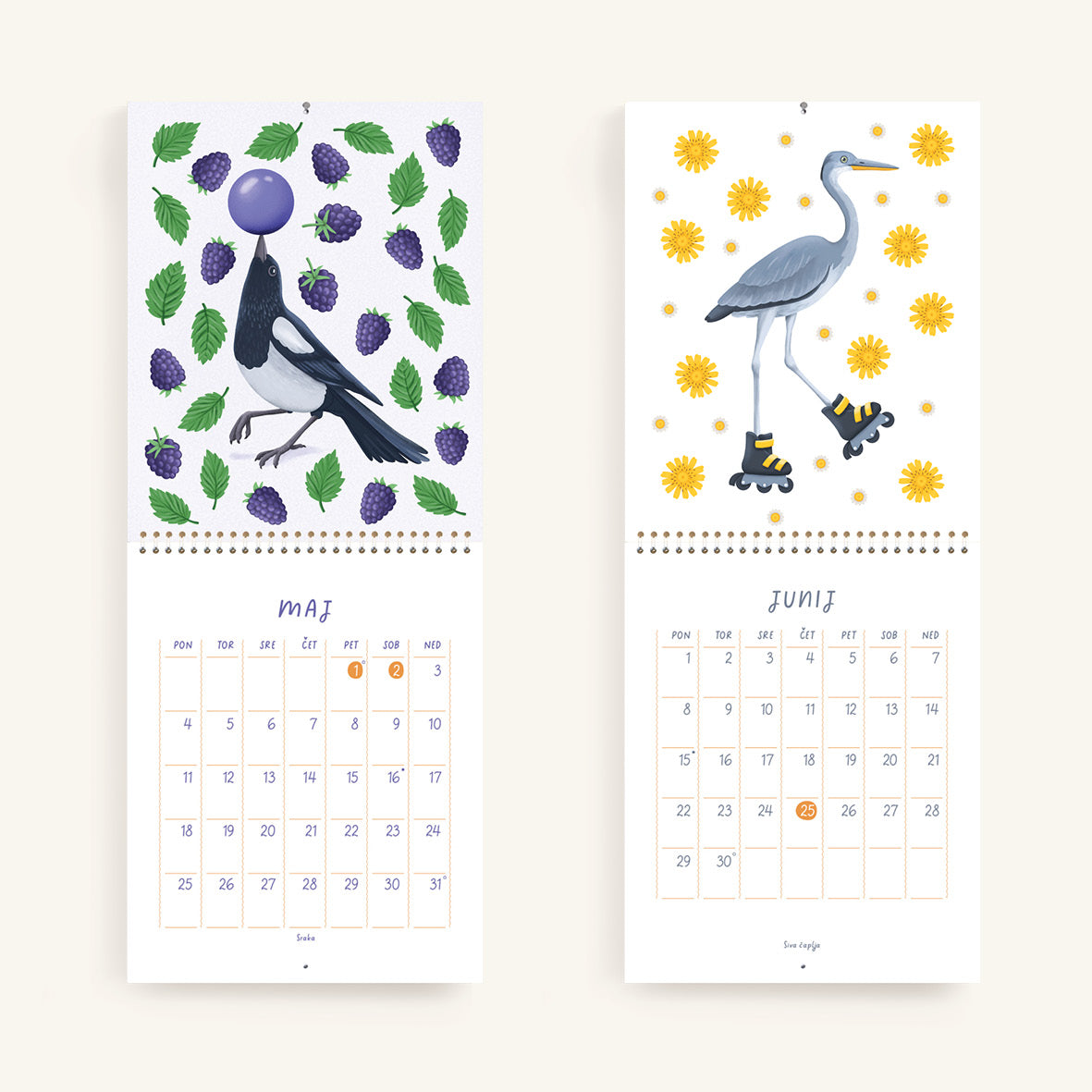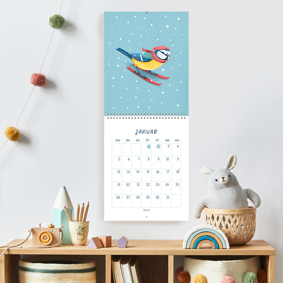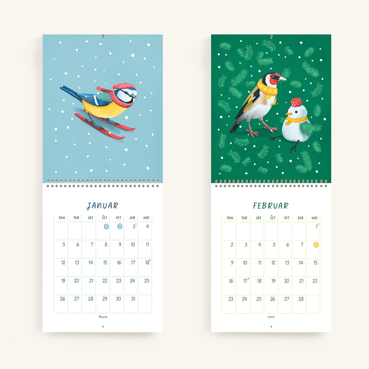 V koledarju z ilustracijami Janje Baznik, boste našli trinajst ilustracij otroško razigranih ptic. Vsak mesec predstavi novo vrsto ptice, ki nam skozi ilustracijo prinaša sporočilo o pomenu gibanja, igre in povezanosti z naravo.
