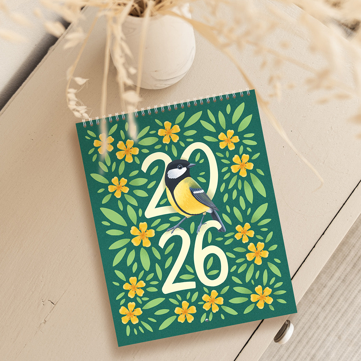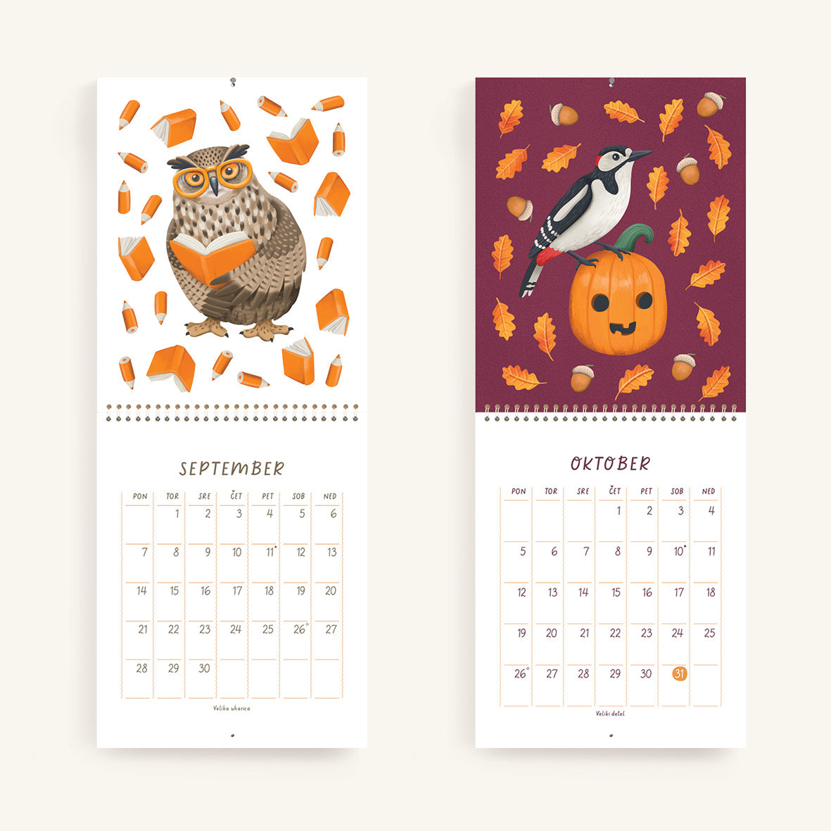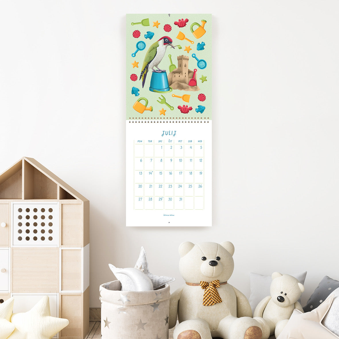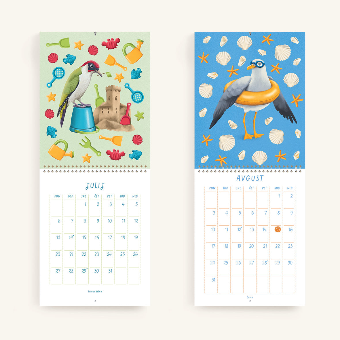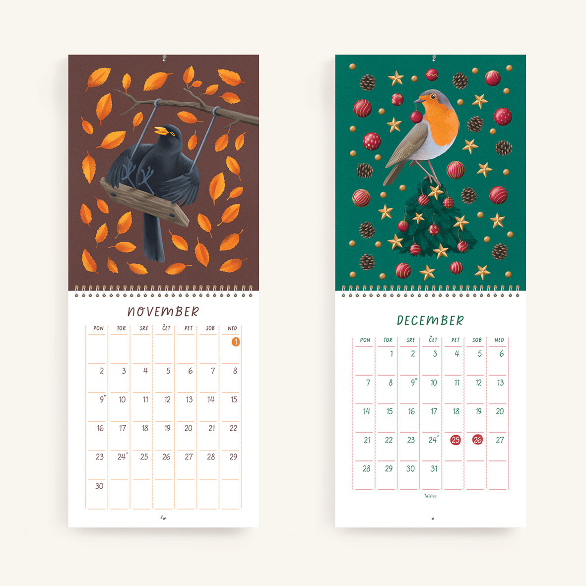 V koledarju z ilustracijami Janje Baznik, boste našli trinajst ilustracij otroško razigranih ptic. Vsak mesec predstavi novo vrsto ptice, ki nam skozi ilustracijo prinaša sporočilo o pomenu gibanja, igre in povezanosti z naravo.