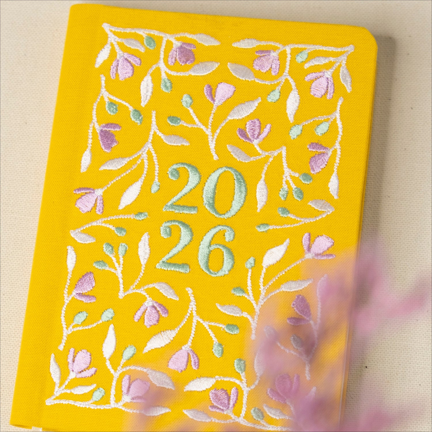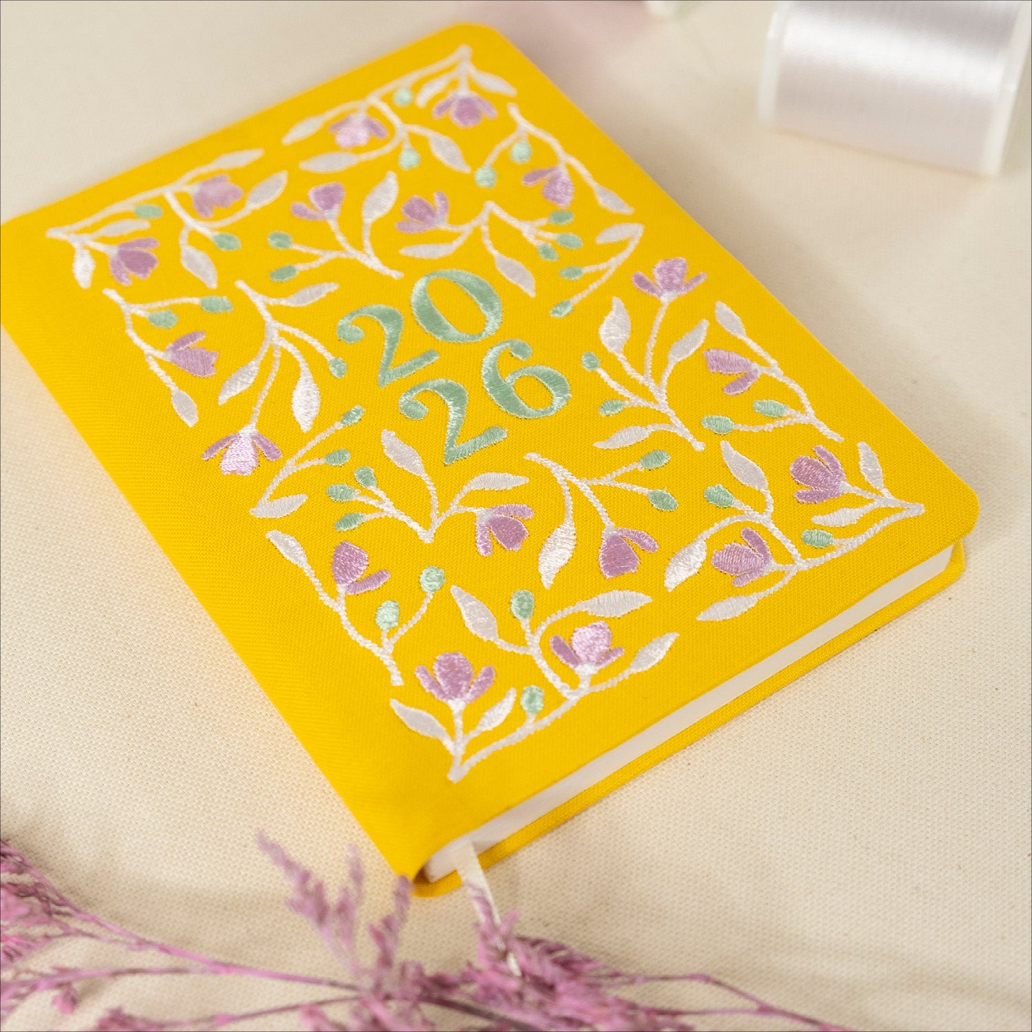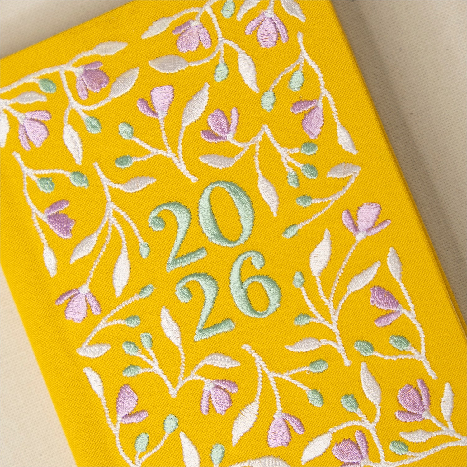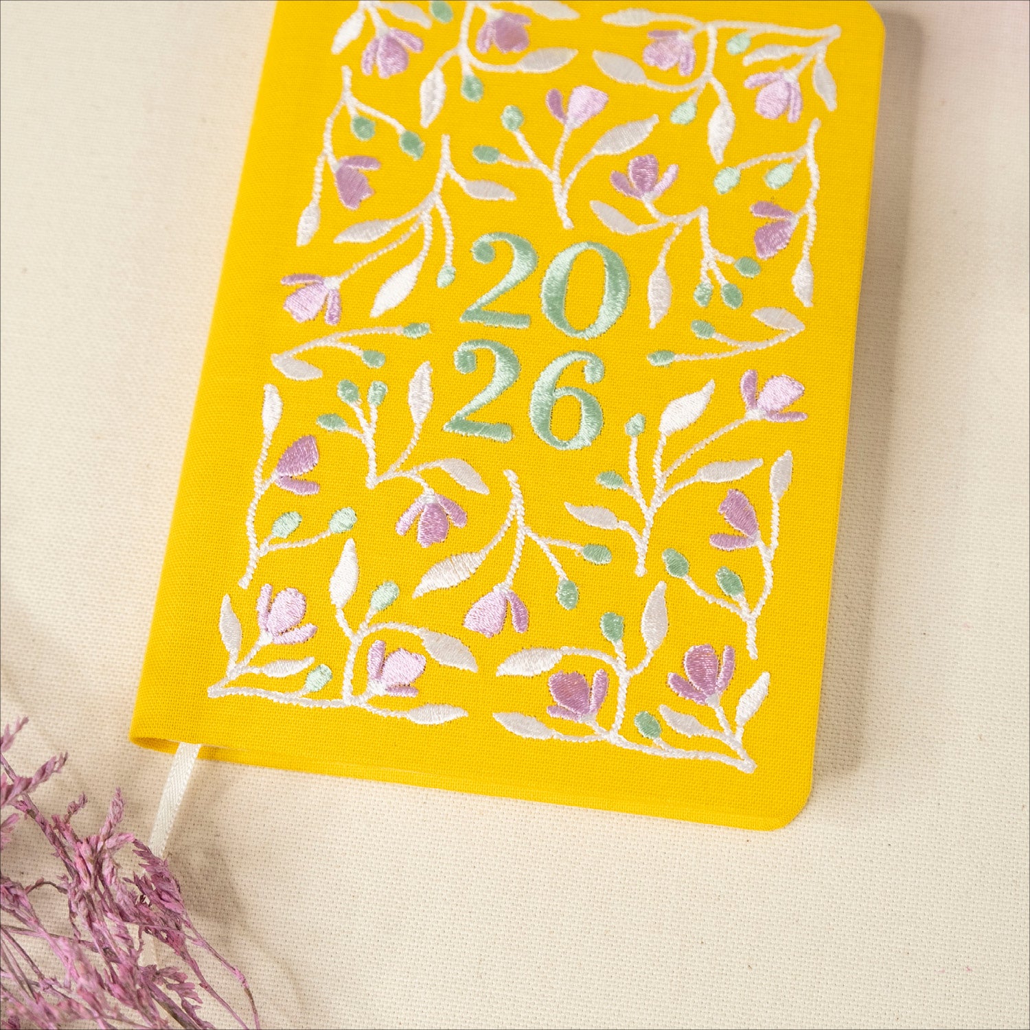 Rumena planer za leto 2026 s trdimi platnicami, oblečenimi v platno na katerega je izvezen cvetlični motiv in letnica 2026. Vsebuje mesečni in tedenski pregled leta.