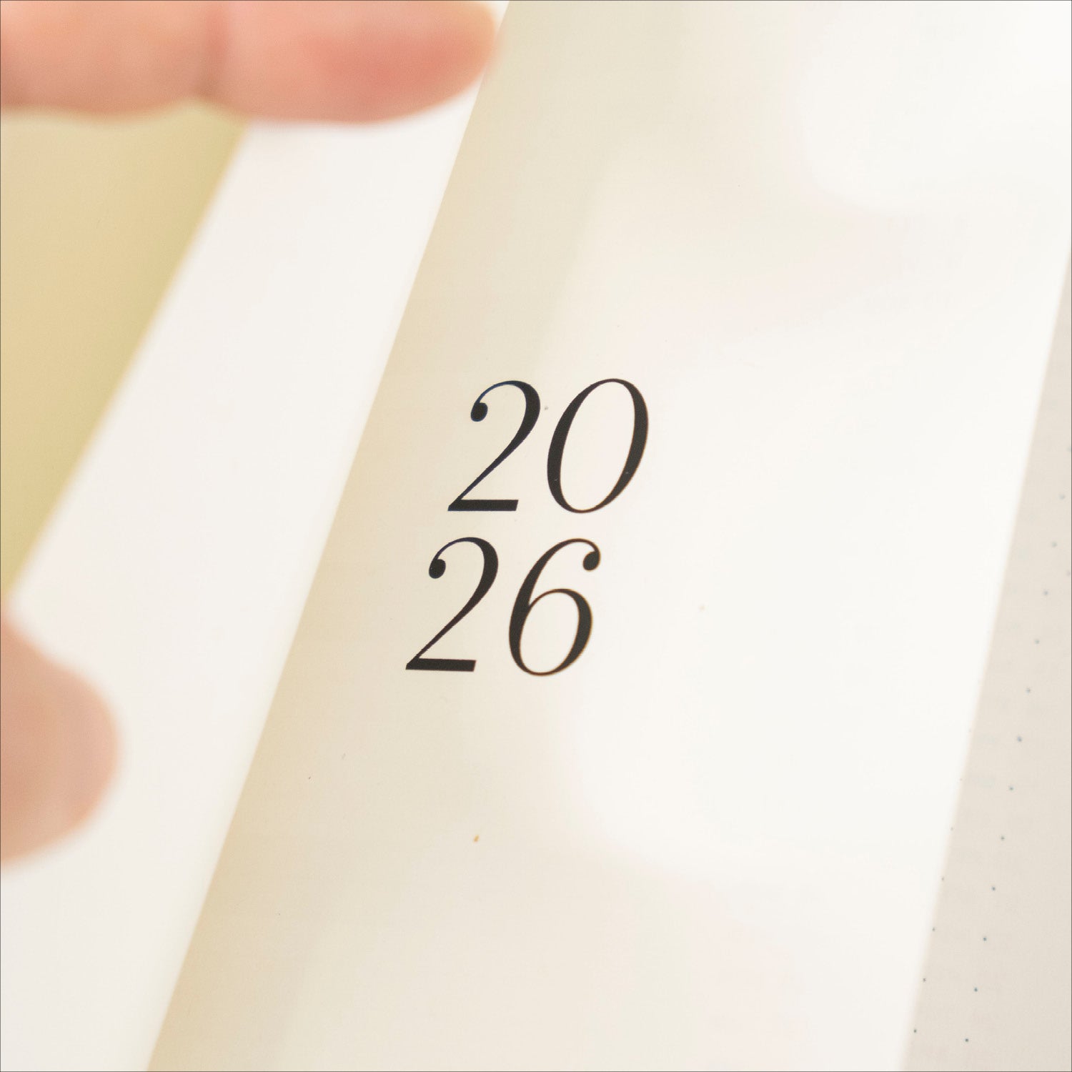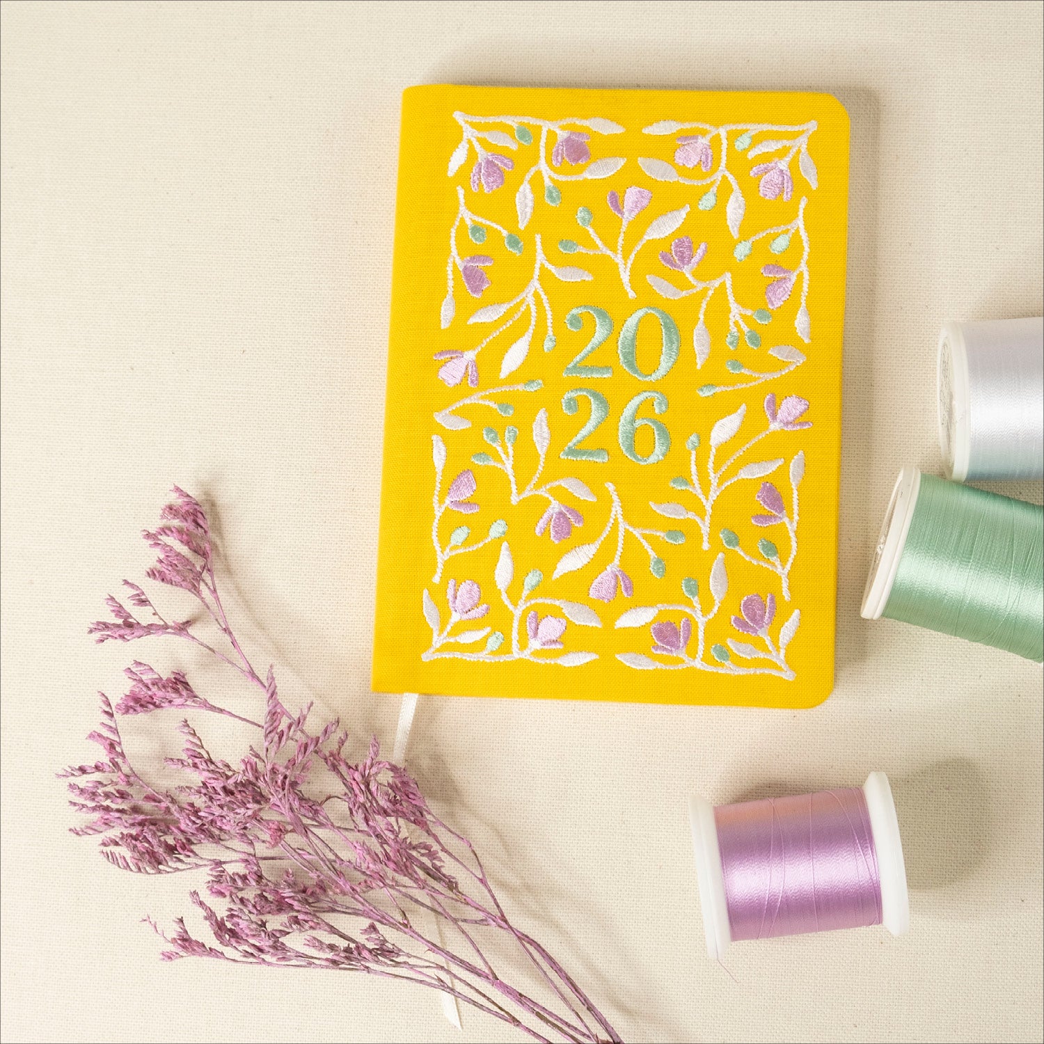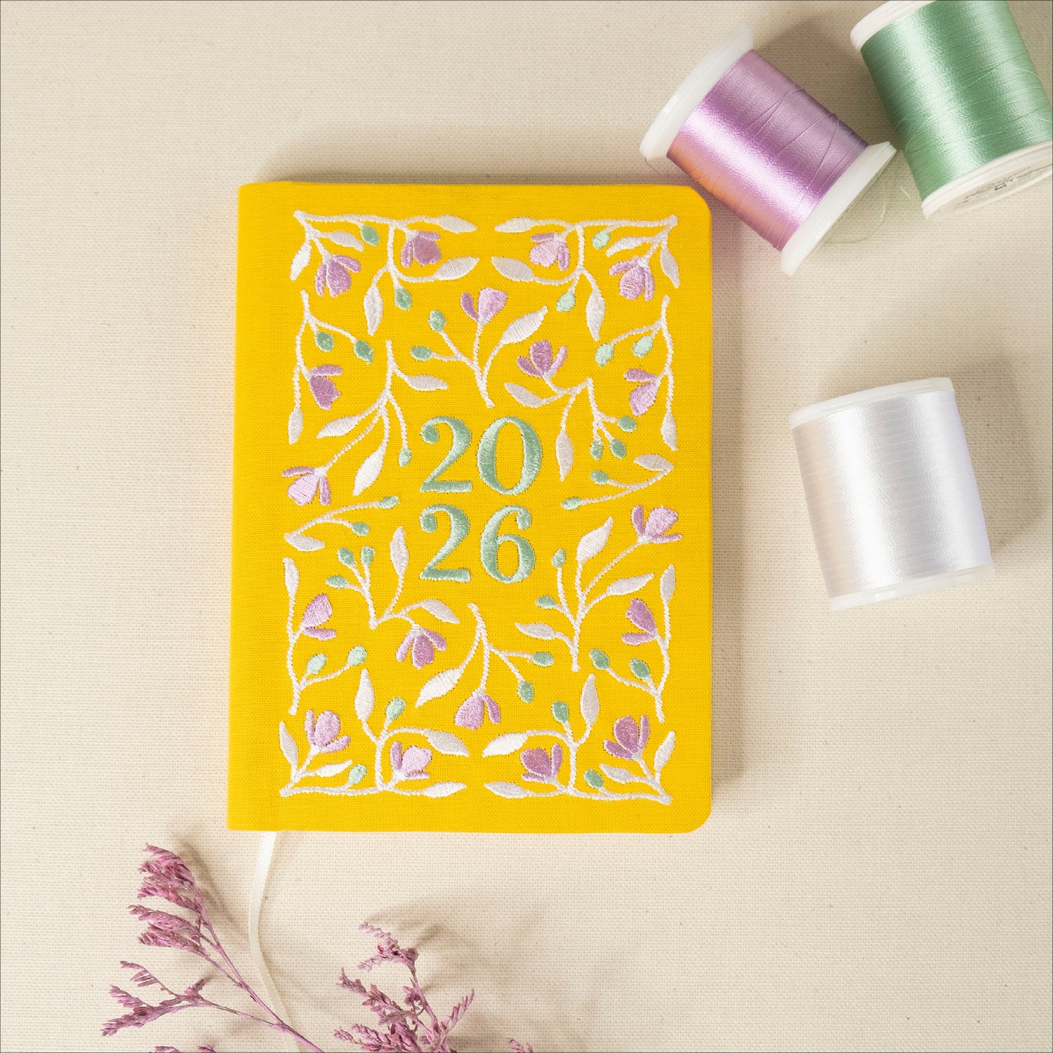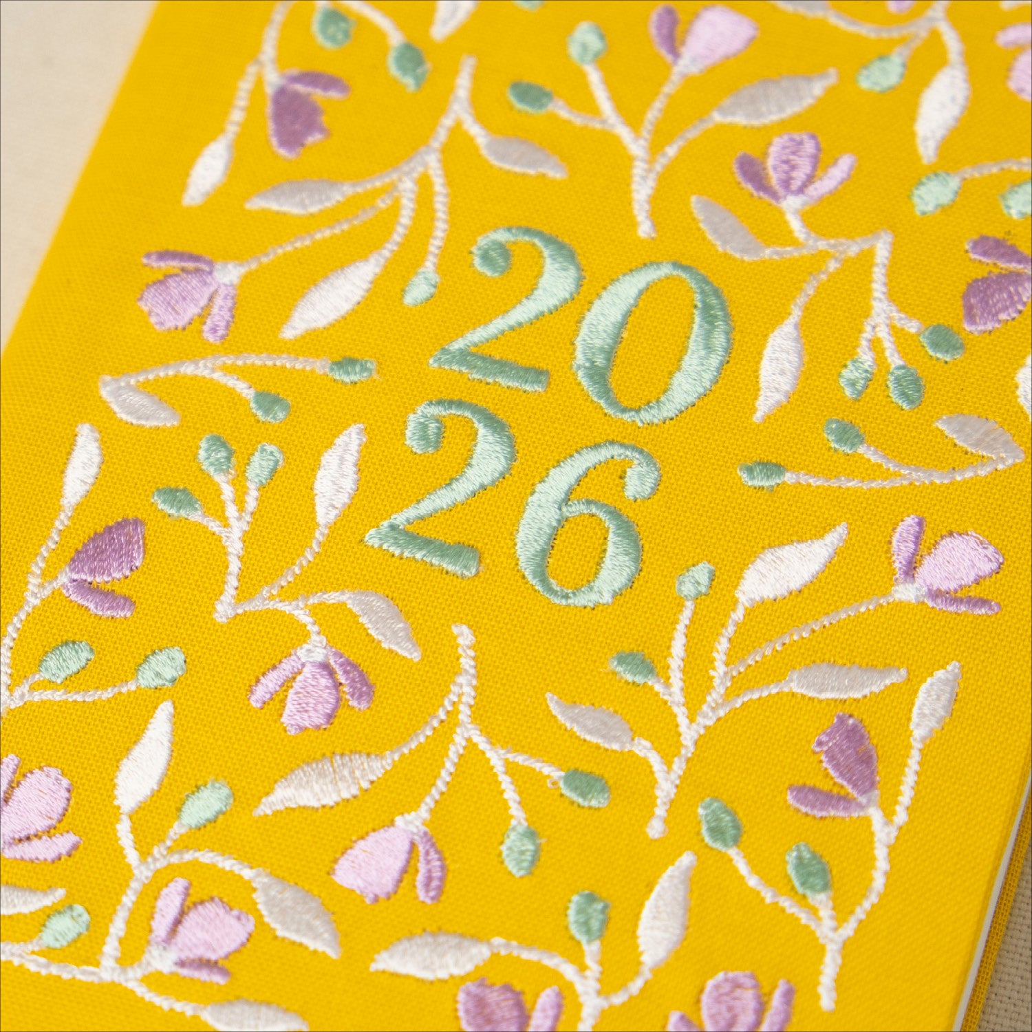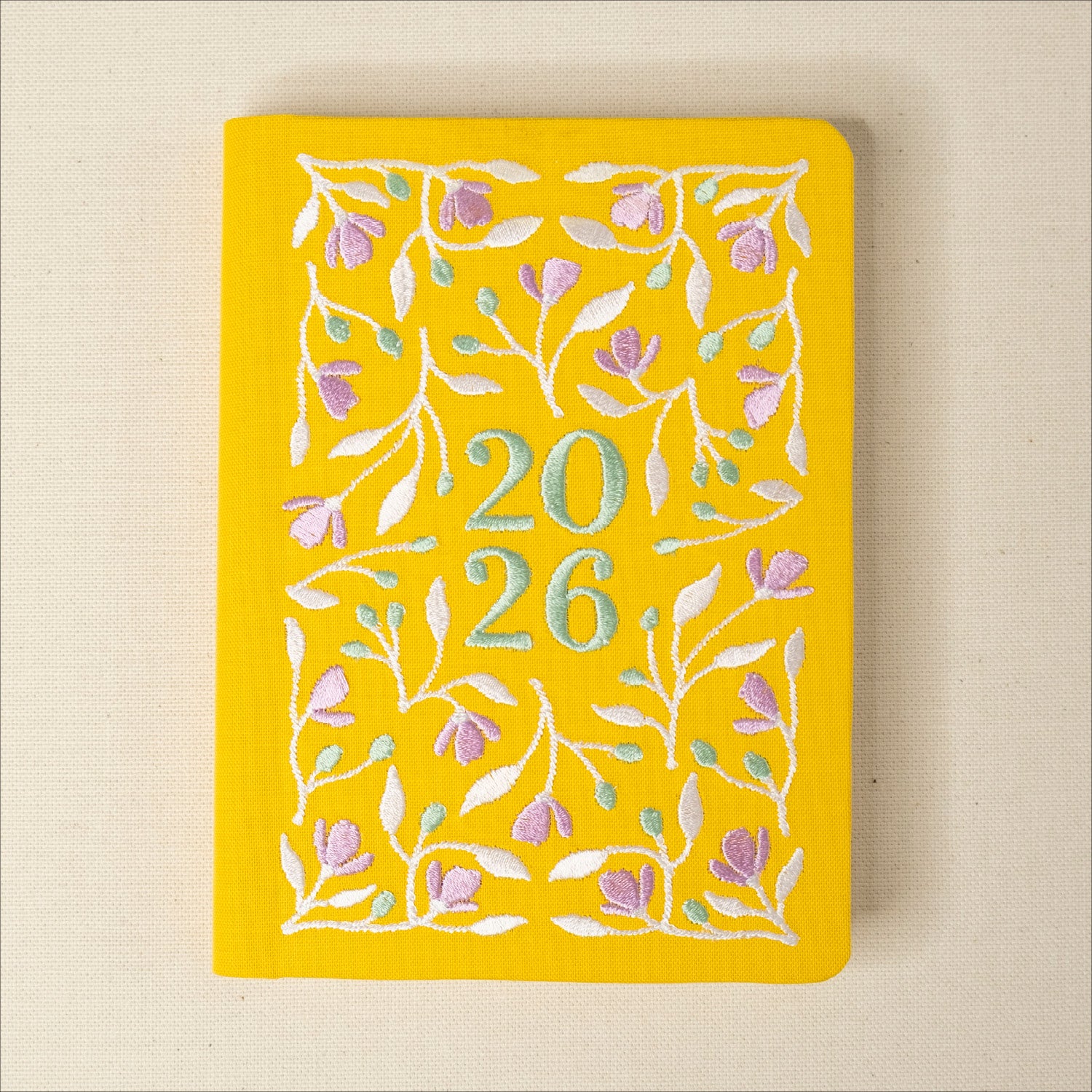 Rumena planer za leto 2026 s trdimi platnicami, oblečenimi v platno na katerega je izvezen cvetlični motiv in letnica 2026. Vsebuje mesečni in tedenski pregled leta.