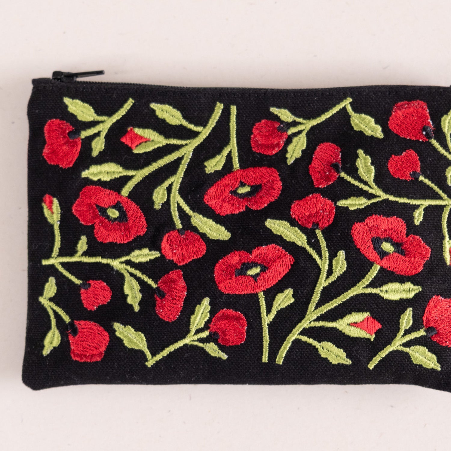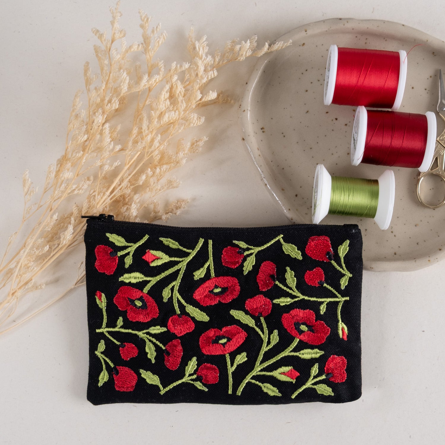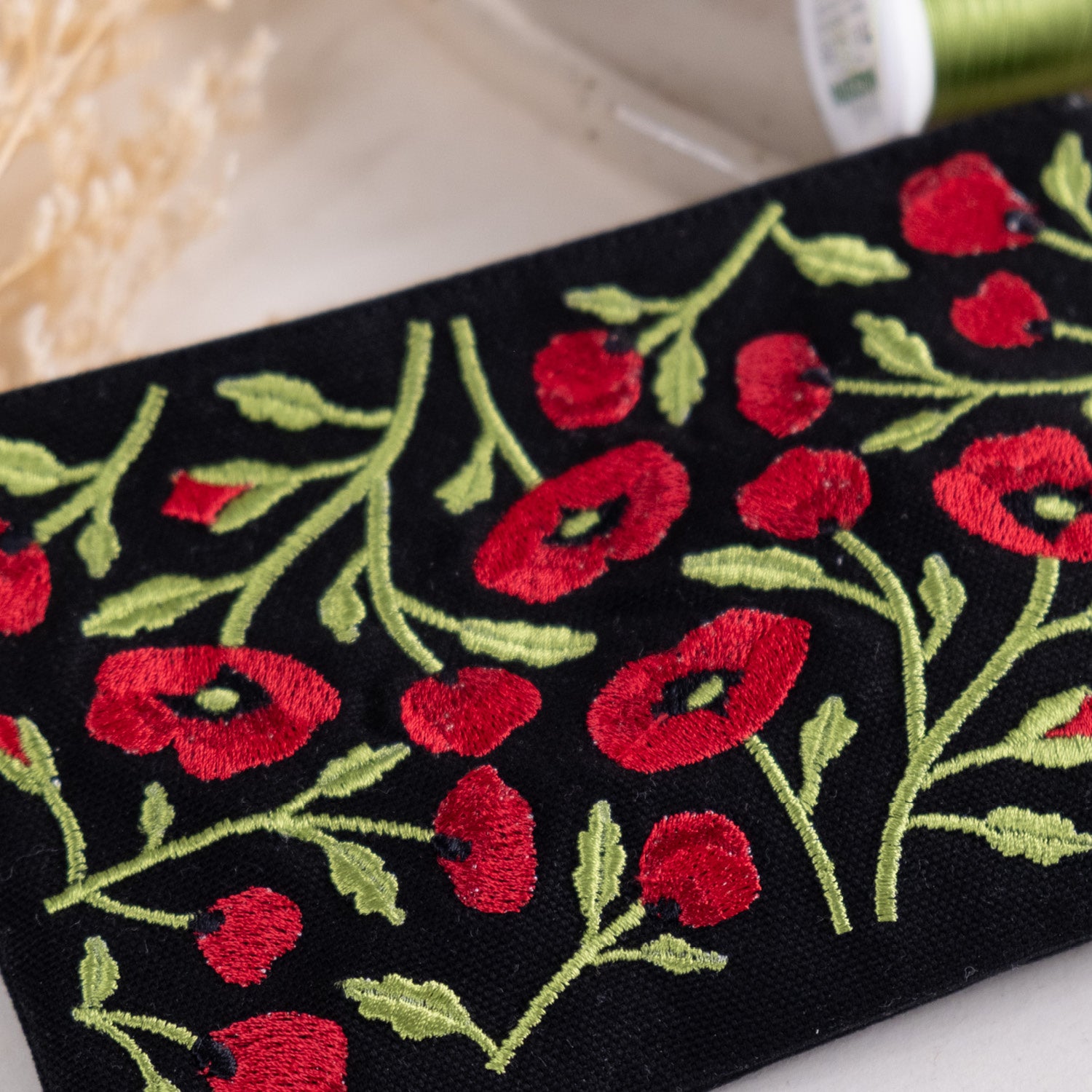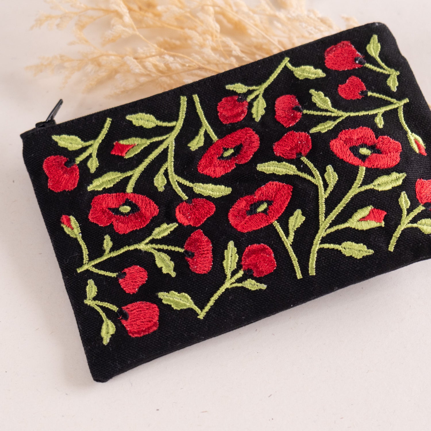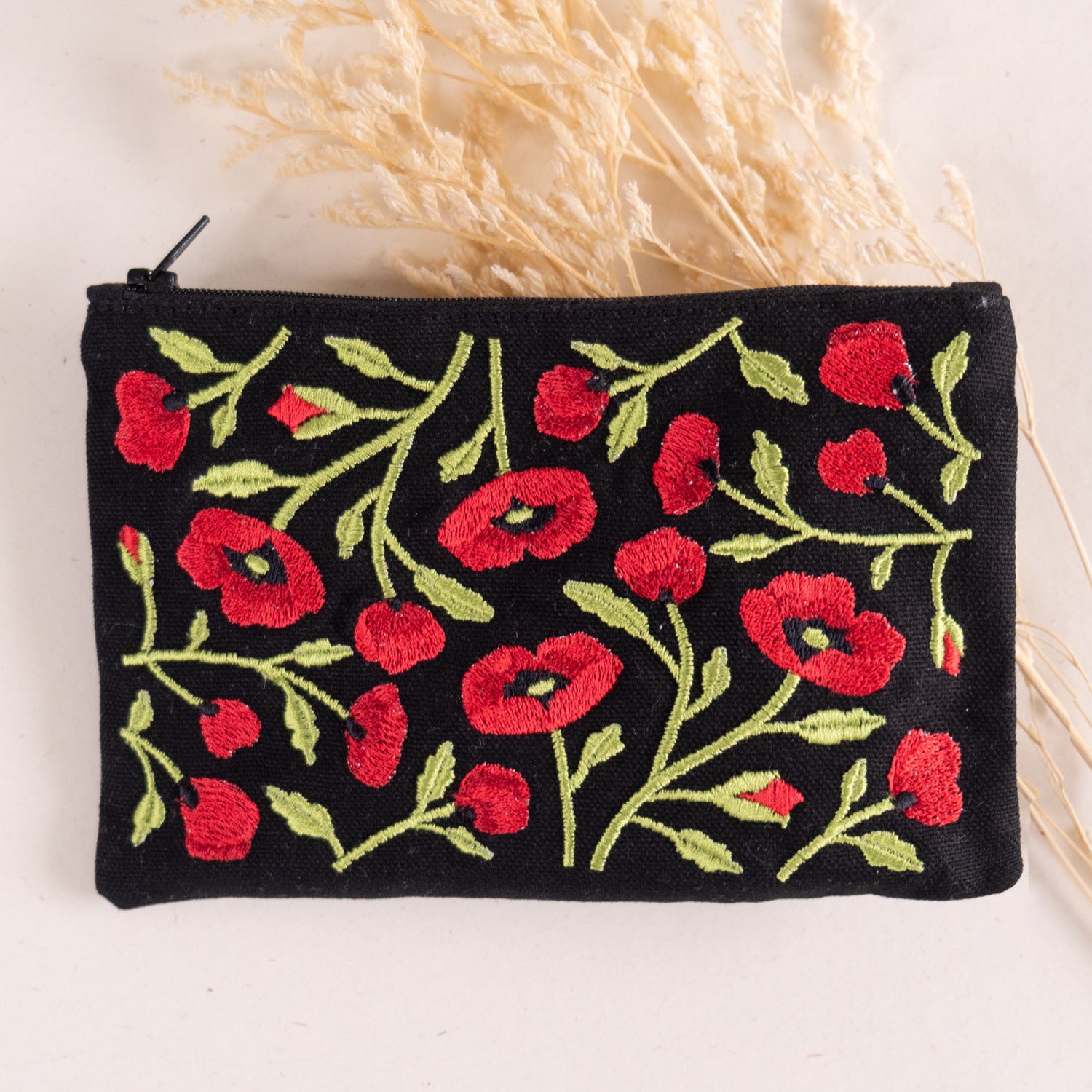 Toaletna torbica z motivi maka izvezenimi na črno blago.