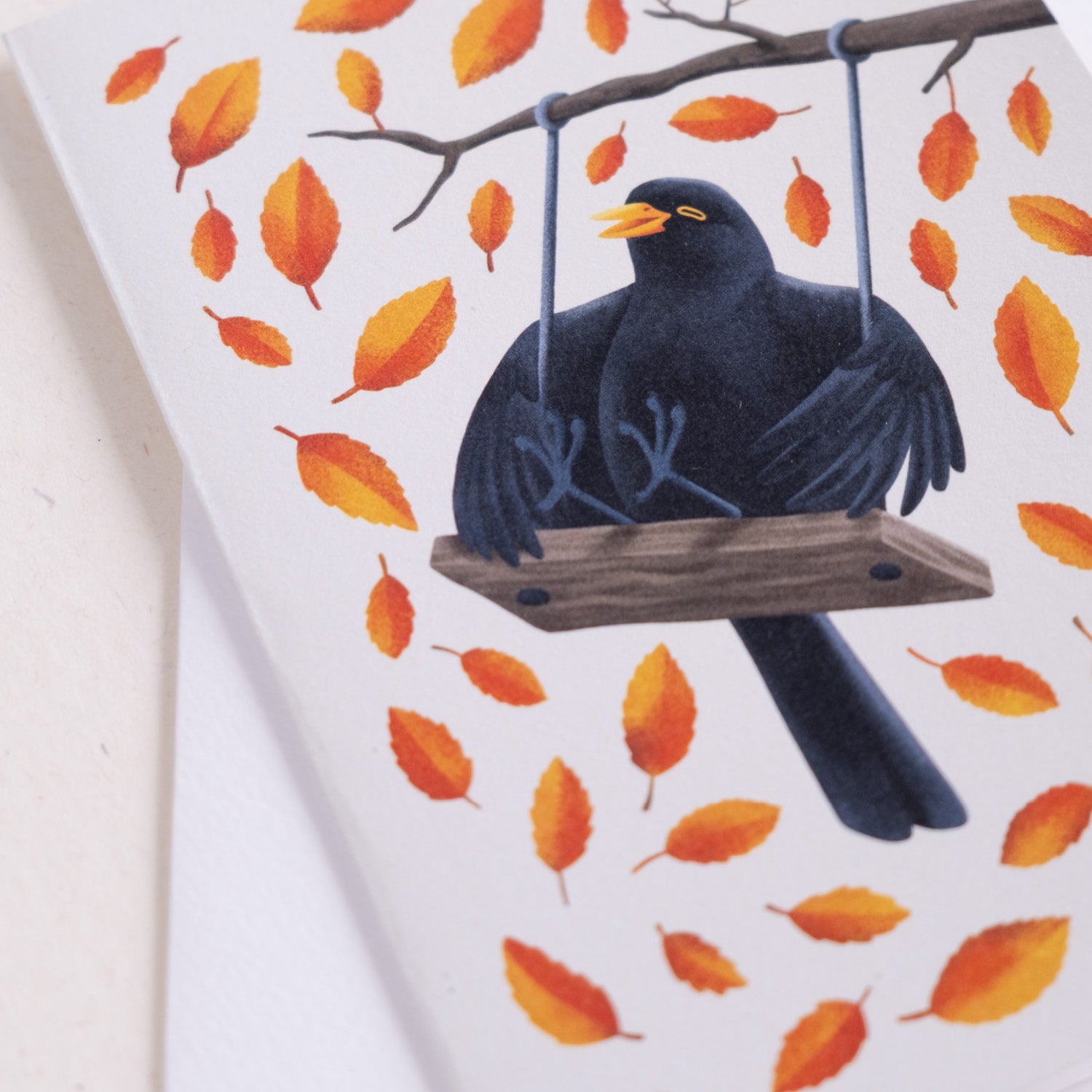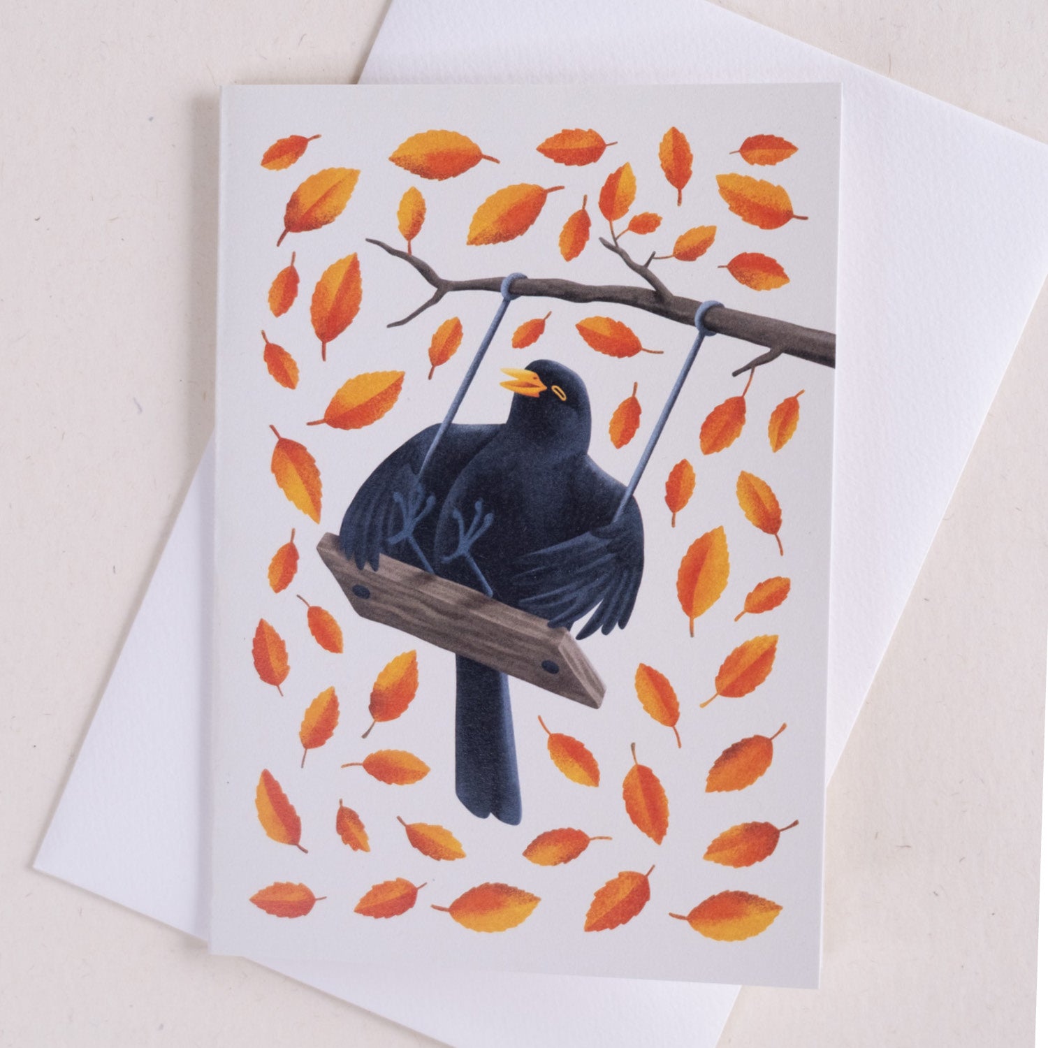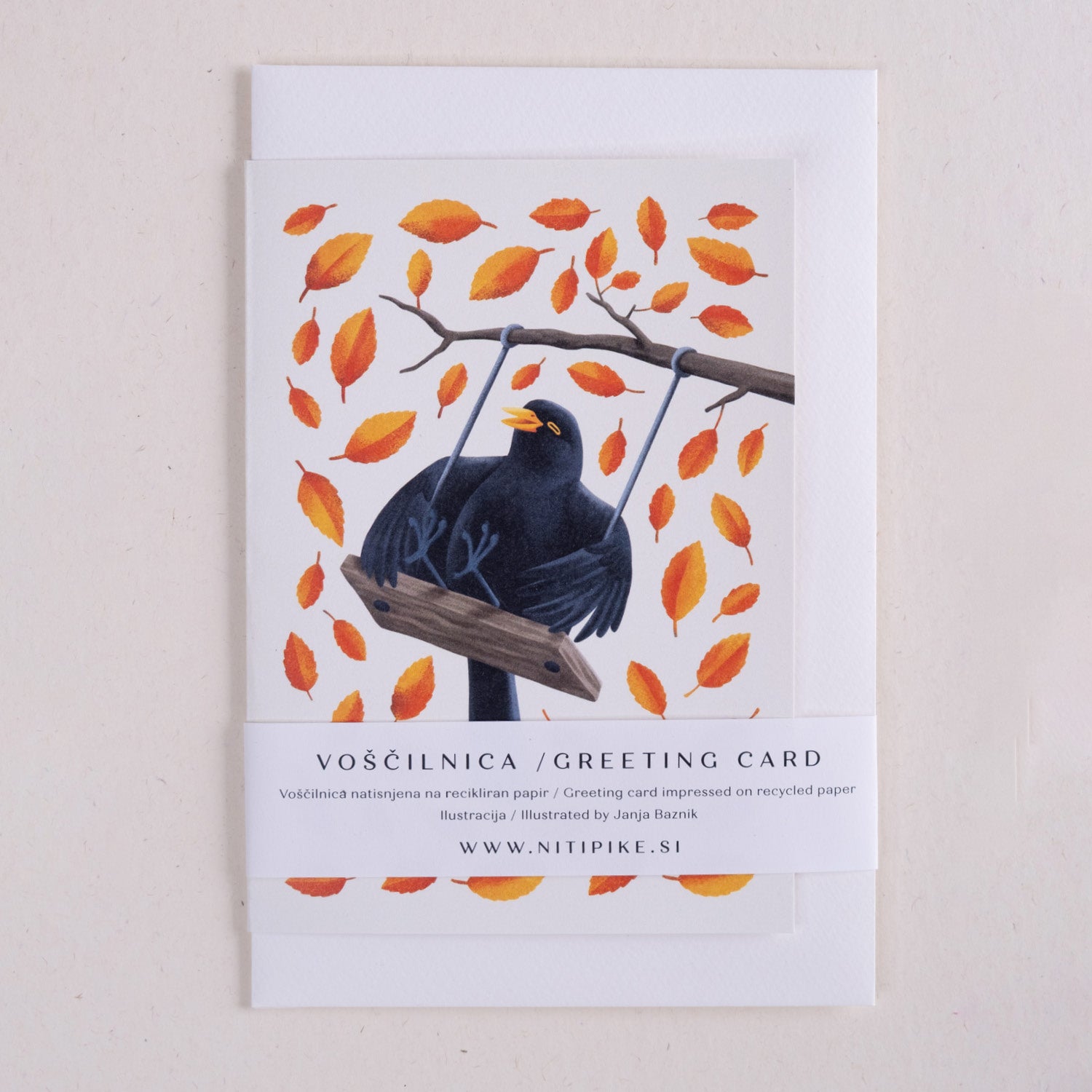 Voščilnica z ilustracijo Janje Baznik prikazuje kosa na gugalnici. Voščilnici je dodana tudi ovojnica.