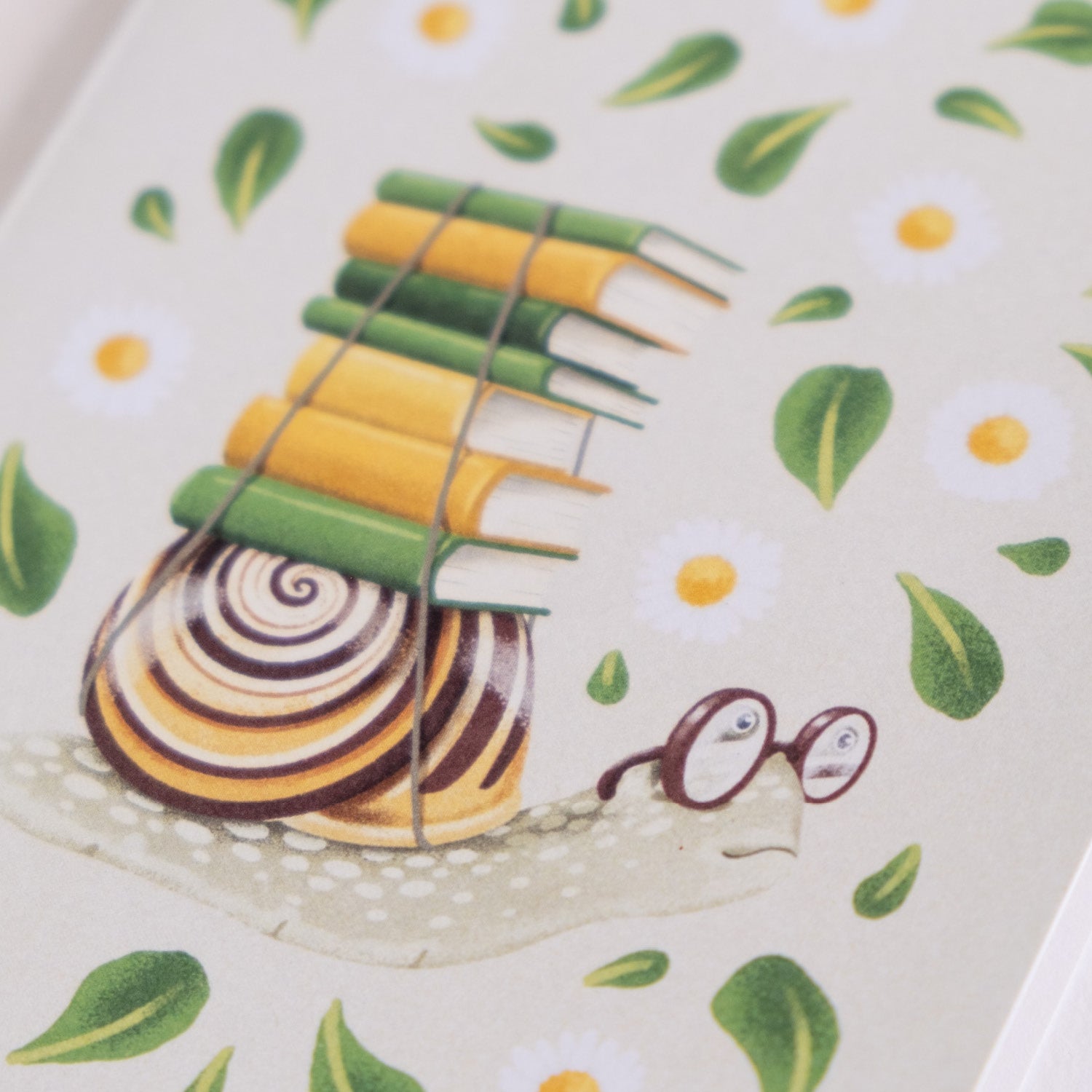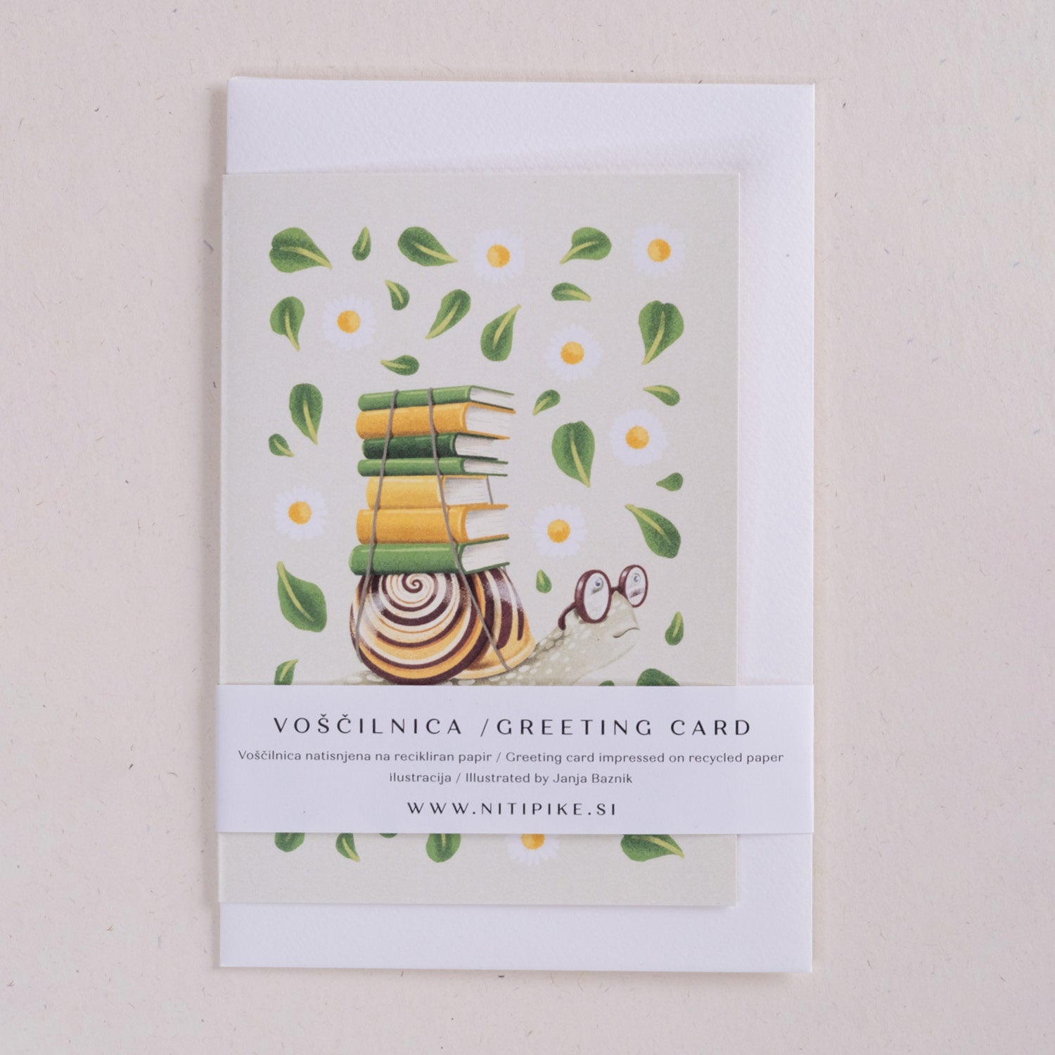 Voščilnica z ilustracijo Janje Baznik, ki prikazuje polžka, ki na svoji hišici nosi kup knjig. Namenjena je vsem ljubiteljem knjig, branja in znanja.