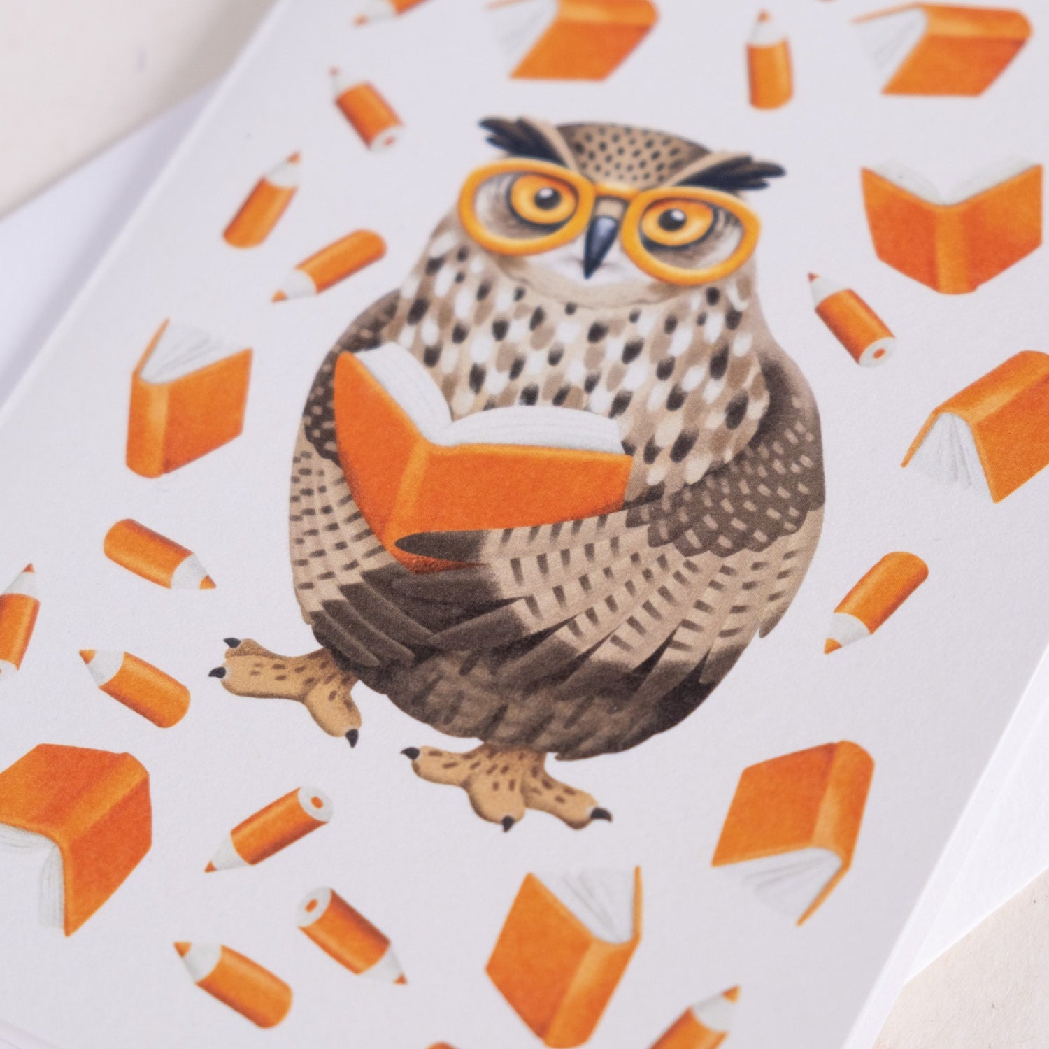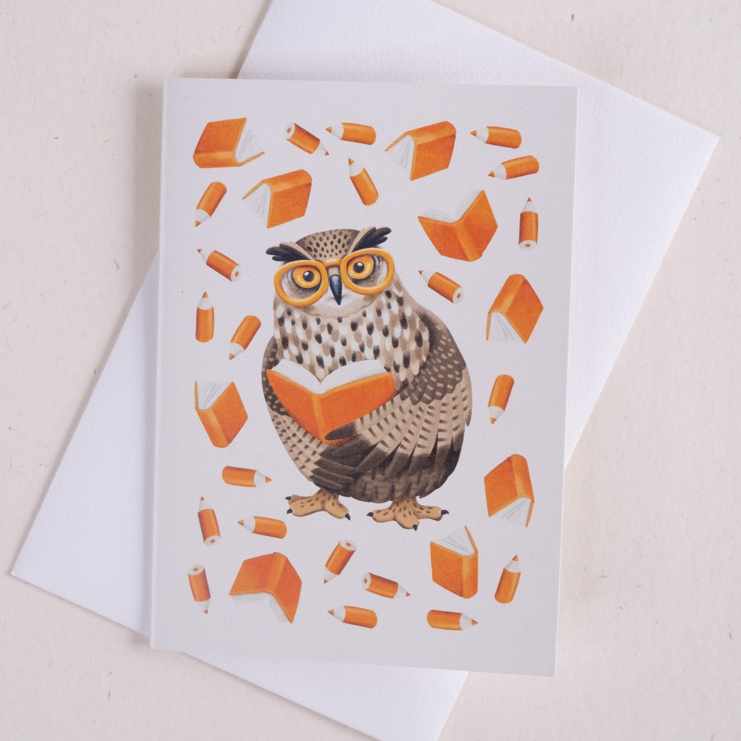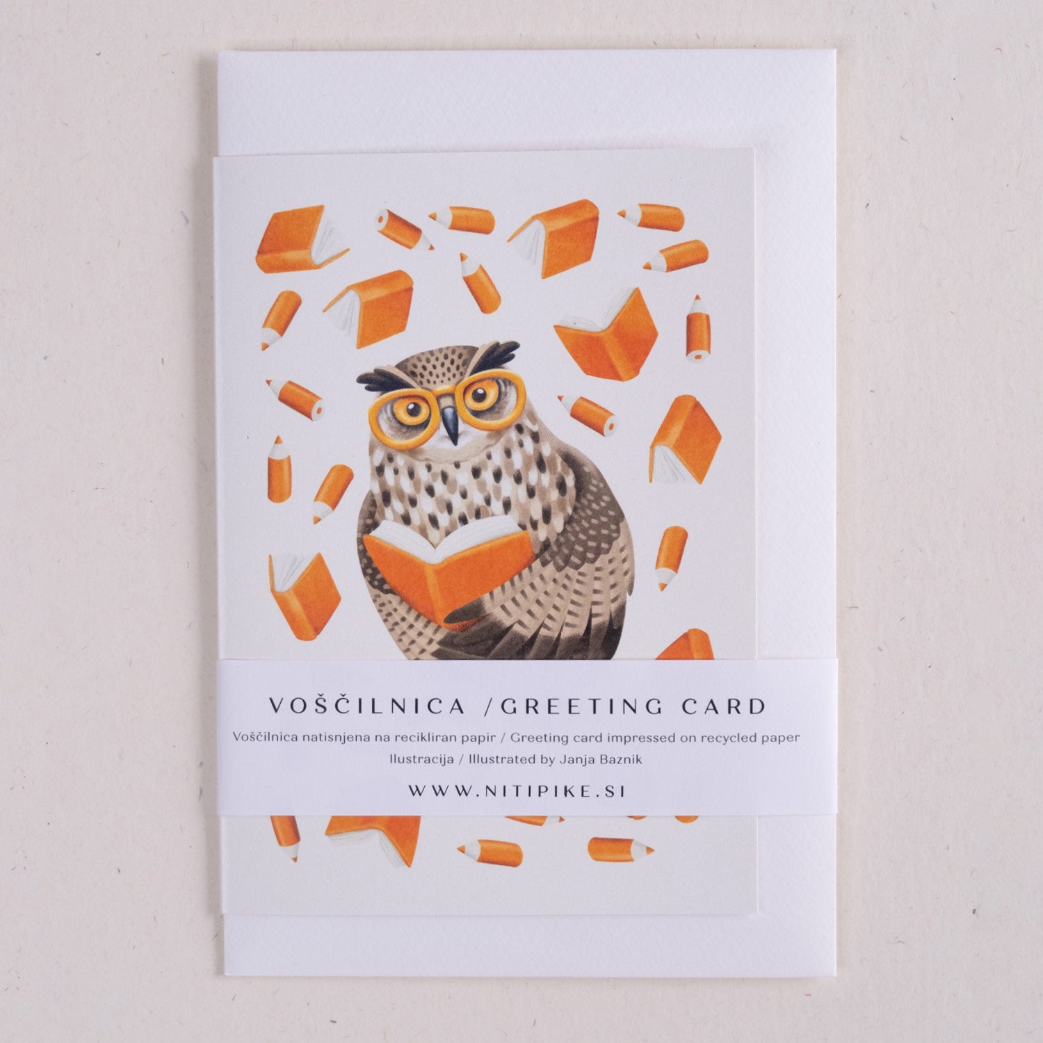 Voščilnica z ilustracijo Janje Baznik, ki prikazuje motiv sove med branjem in obdane s knjigami in svinčniki.