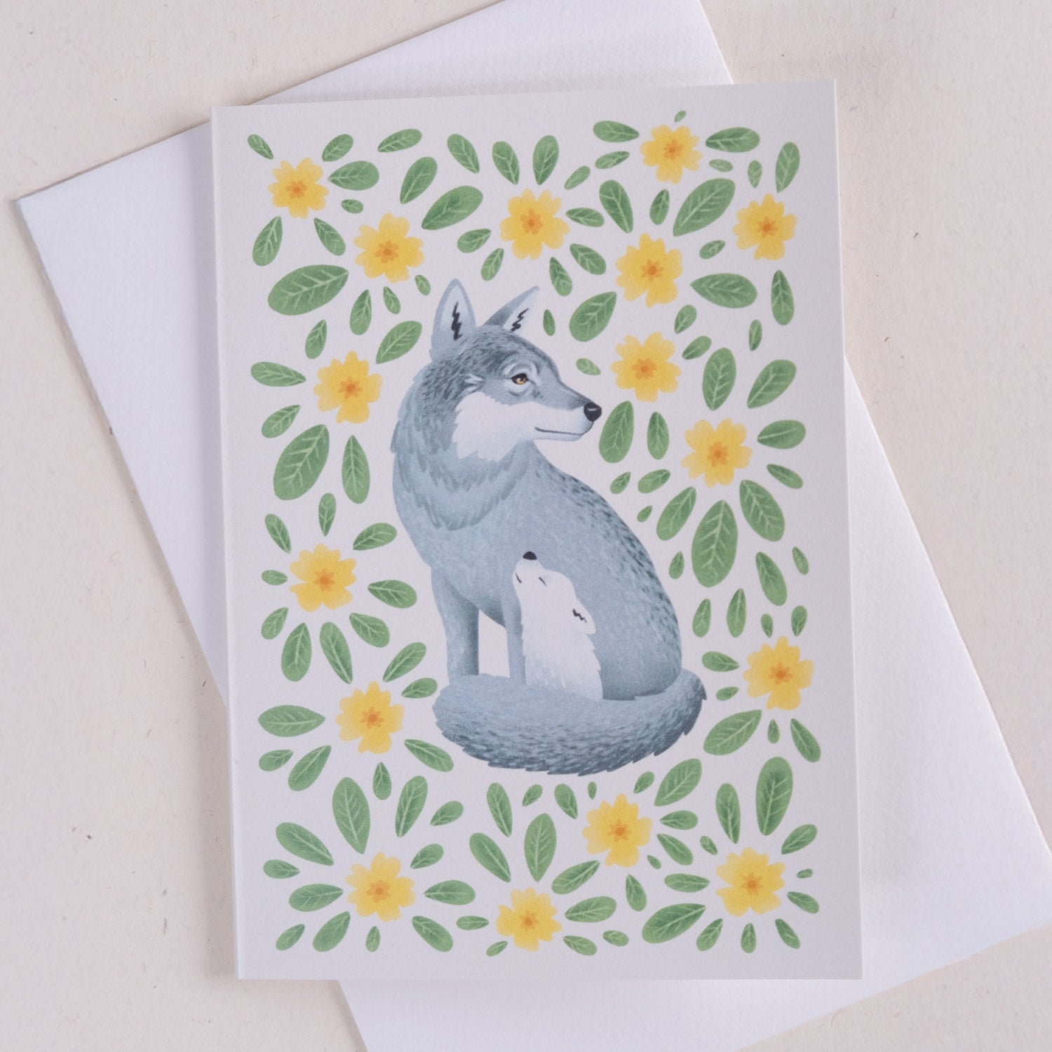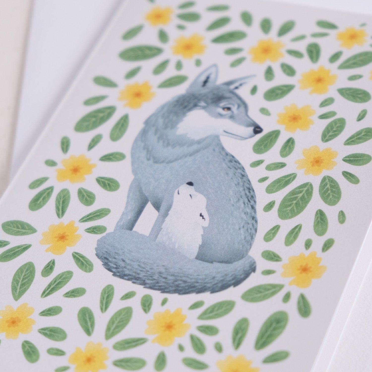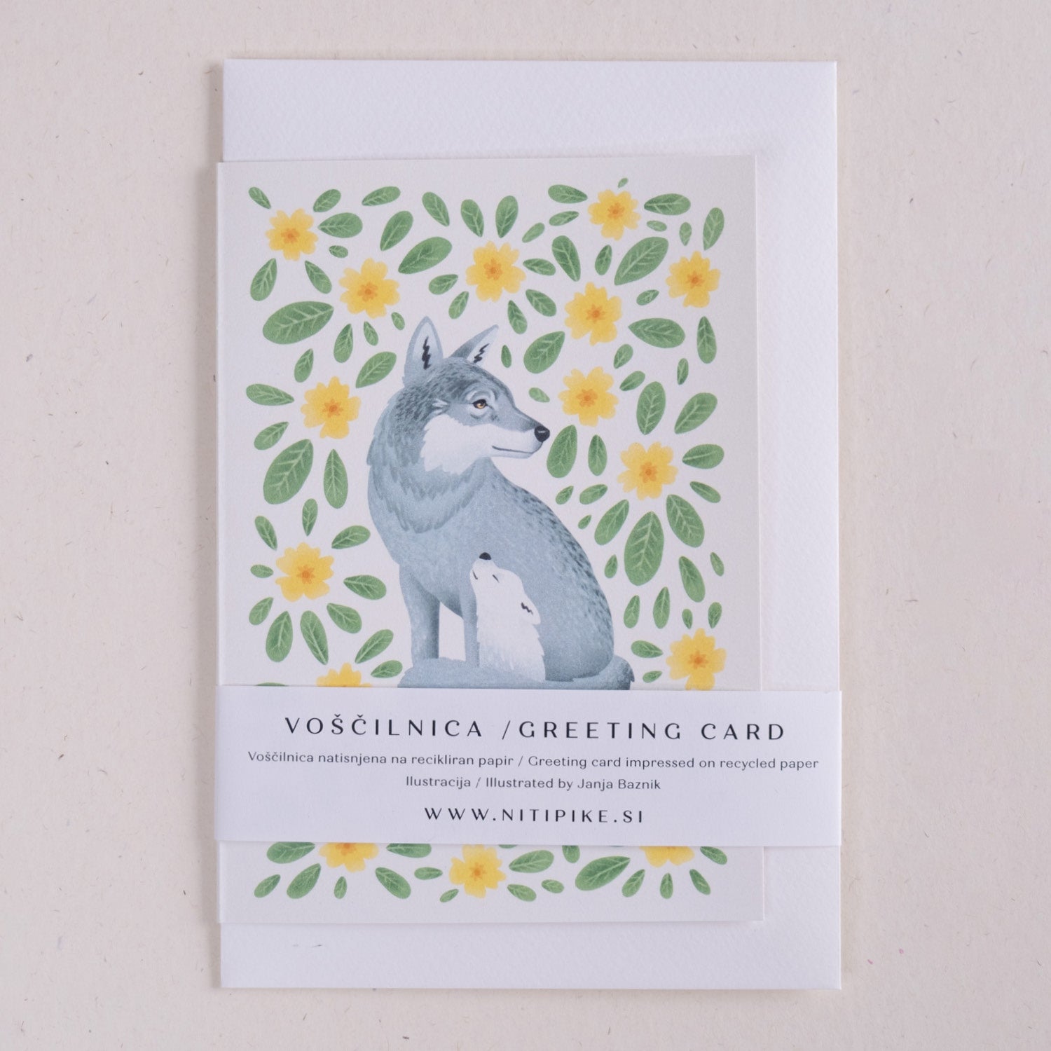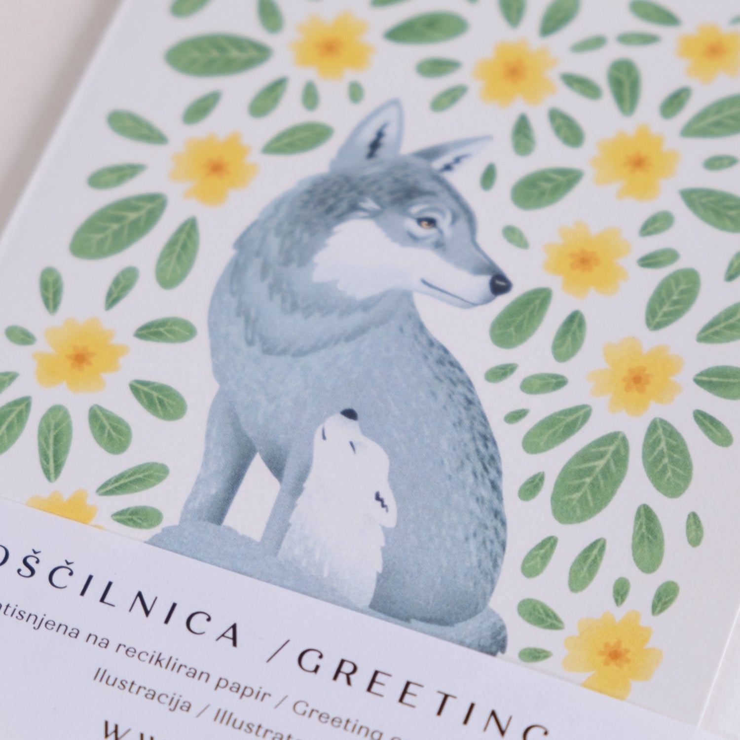 Voščilnica z ilustracijo Janje Baznik, ki prikazuje motiv volka, ki varuje svojega mladička. Obdana sta s cvetovi in listi trobentic.