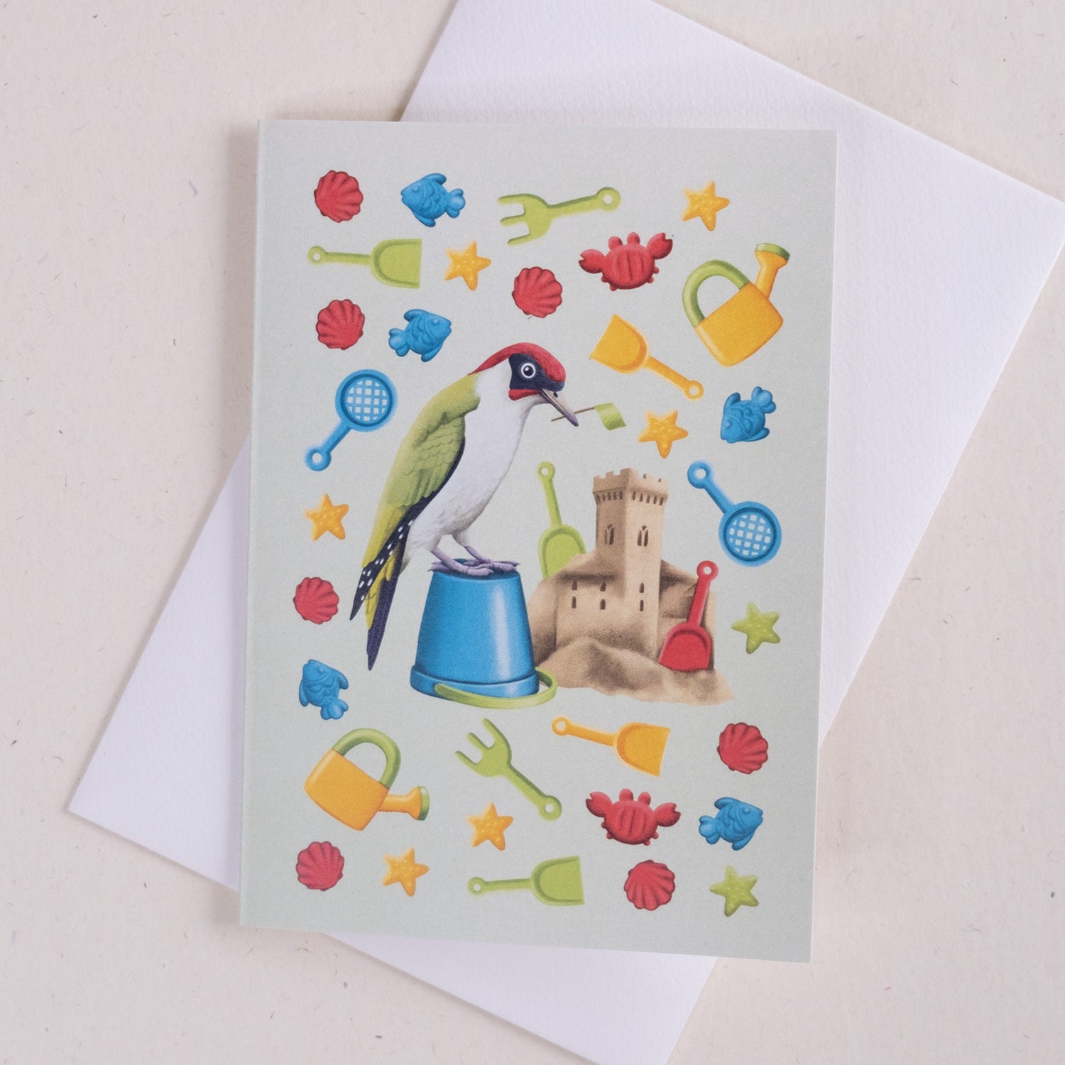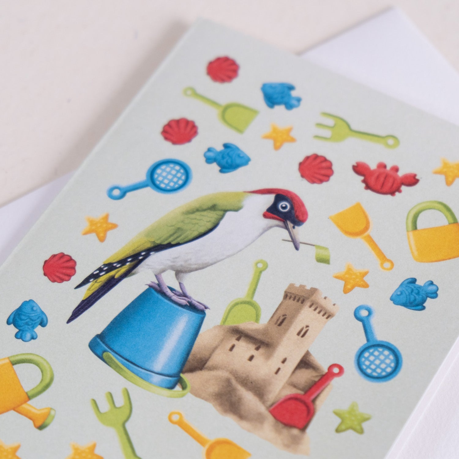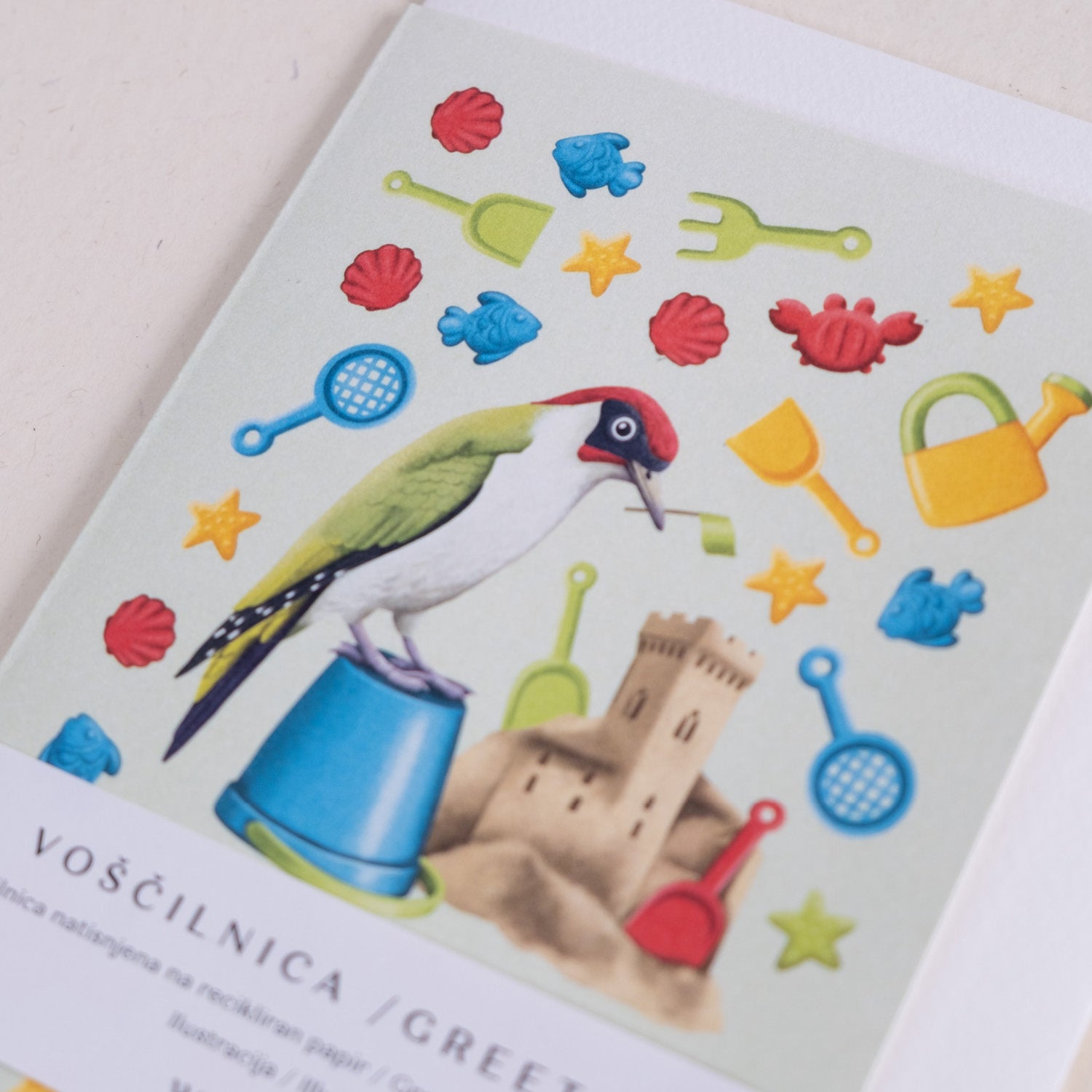 Voščilnica z ilustracijo Janje Baznik, ki prikazuje motiv zelene žolne med igro v peskovniku. Obdajajo jo pisano orodje za izdelavo peščenih skulptur.
